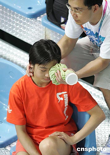 中國跳水女選手勞麗詩當(dāng)?shù)貢r間八月十二日在雅典訓(xùn)練前,由隊醫(yī)幫助用冰袋治療眼睛疾患。中新社記者:毛建軍