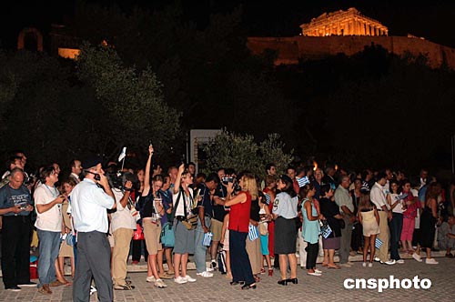 當(dāng)?shù)貢r(shí)間8月12日傍晚,奧運(yùn)火炬即將到達(dá)雅典衛(wèi)城,市民夾道迎接圣火到來。中新社記者:張煒