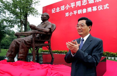 在揭幕儀式上,胡錦濤表示,鄧小平為中國革命、建設(shè)、改革事業(yè)建立的偉大功勛將永載史冊,他留下的寶貴精神財富將永遠激勵我們前進。上午九時十五分,胡錦濤親手揭下覆蓋在鄧小平銅像上的紅綢。一時熱烈的掌聲雷動。
