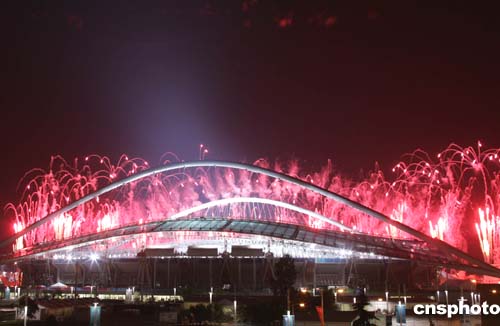 當?shù)貢r間8月13日晚,雅典奧運會盛大的開幕式在主體育場舉行,五顏六色的焰火映紅雅典夜空。中新社記者:任晨鳴