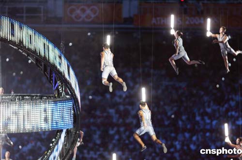 當(dāng)?shù)貢r(shí)間八月十三日晚,第二十八屆奧運(yùn)會(huì)在希臘雅典開幕。圖為奧運(yùn)開幕式上的飛天表演。中新社記者:毛建軍