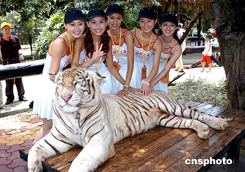 八月十五日,第五屆明日之星影視新星的入選選手來(lái)到廣州番禺香江野生動(dòng)物世界拍攝外景。圖為美女與白老虎合影。作者:劉衛(wèi)勇