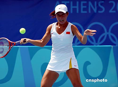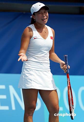 中國唯一參加雅典奧運(yùn)會女子網(wǎng)球單打比賽的鄭潔,當(dāng)?shù)貢r(shí)間8月15日首輪迎戰(zhàn)日本名將山杉愛,在大好局面下可惜以微弱比分失敗。中新社記者:任晨鳴