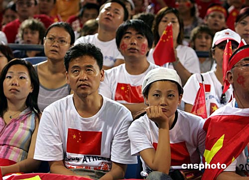 當?shù)貢r間8月15日,中國男籃在雅典奧運會首輪比賽中迎戰(zhàn)西班牙隊,最終中國隊以大比分負于對手。圖為現(xiàn)場觀戰(zhàn)的中國球迷感到十分失望。中新社記者:任晨鳴