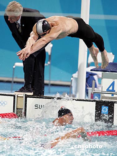 當?shù)貢r間八月十五日晚,在雅典舉行的第二十八屆奧運會游泳比賽中,南非選手以三分十三秒一七的成績獲得男子四乘一百米自由泳接力賽金牌。中新社記者:毛建軍