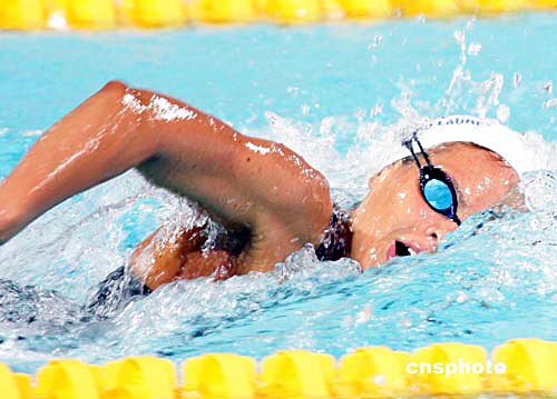 當(dāng)?shù)貢r間八月十五日晚,在雅典舉行的第二十八屆奧運會游泳比賽中,法國選手MANAUDOU LAURE以四分零五秒三四的成績獲得女子四百米自由泳金牌。中新社記者:毛建軍