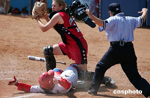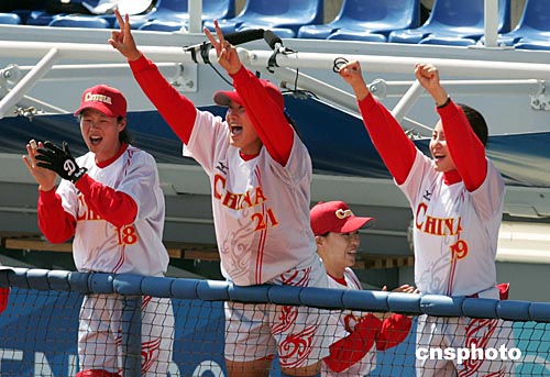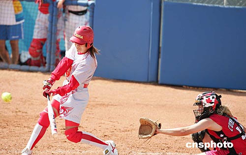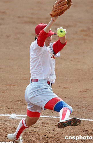 當?shù)貢r間八月十六日,在雅典奧運女子壘球比賽中,中國隊四比二戰(zhàn)勝加拿大隊。中新社記者:毛建軍