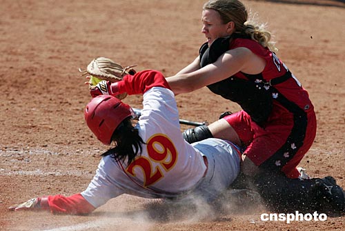 當?shù)貢r間八月十六日,在雅典奧運女子壘球比賽中,中國隊四比二戰(zhàn)勝加拿大隊,二十九號郭佳搶壘得分。中新社記者:毛建軍
