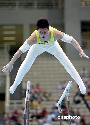 當(dāng)?shù)貢r間八月十六日晚,雅典奧運(yùn)男子體操團(tuán)體比賽在奧運(yùn)體操比賽館舉行,中國隊衛(wèi)冕失利,僅獲得第五名。中新社記者:毛建軍