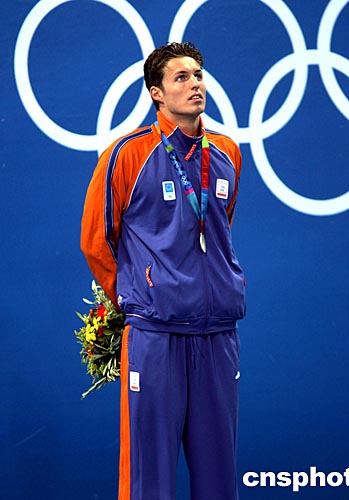 當(dāng)?shù)貢r(shí)間8月16日晚,荷蘭的游泳超級世界明星霍根班德,在雅典奧運(yùn)會男子100米自由泳決賽中獲得亞軍。中新社記者:任晨鳴