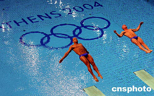 當(dāng)?shù)貢r(shí)間8月16日晚在雅典奧運(yùn)會(huì)跳水館,世界各國(guó)選手為實(shí)現(xiàn)各自的奧運(yùn)夢(mèng)想而從十米跳臺(tái)縱身躍入湛藍(lán)的碧波之中。中新社記者:任晨鳴