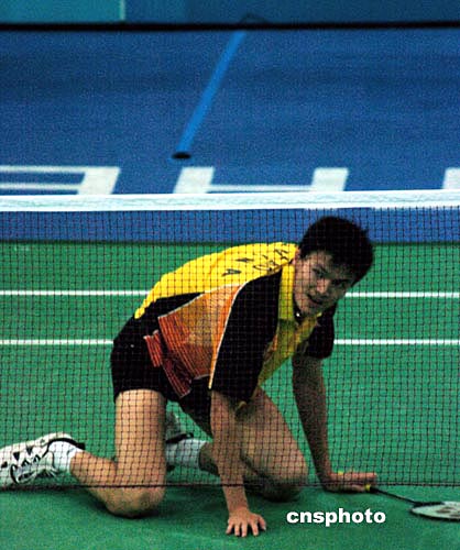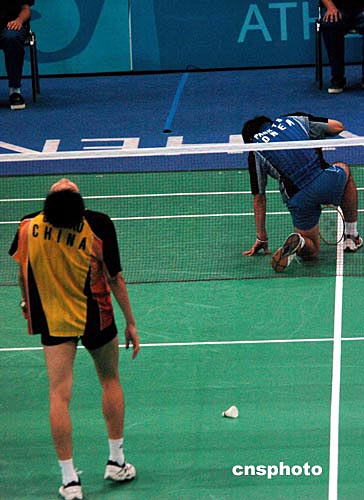 中國羽球選手鮑春來與韓國樸泰相在激烈對抗后均認(rèn)為自己失手而雙雙長嘆。后裁判認(rèn)定該球韓國選手勝。最終結(jié)果是鮑春來被淘汰。作者:陳佳