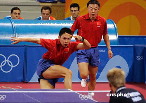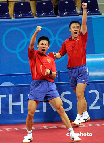 雅典時(shí)間八月十八日上午,中國乒乓球男雙搭檔馬琳、陳杞以中4:2戰(zhàn)勝荷蘭選手凱恩、赫斯特爾,晉級(jí)奧運(yùn)男雙8強(qiáng)。中新社記者:張煒