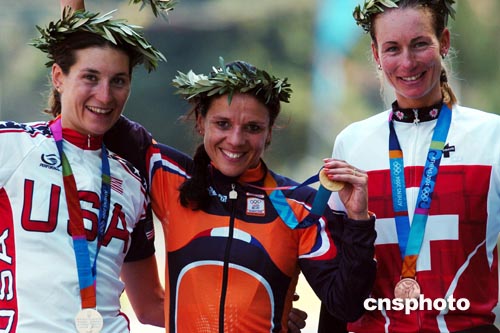 當?shù)貢r間8月18日,荷蘭選手Zijlaard-van-Moorsel喜摘女子自行車24公里賽桂冠。圖為她和亞軍美國選手Deidre Demet-Barry及銅牌得主Karin Thuerig一起登上領獎臺。