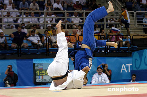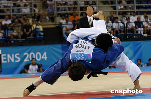 圖為在當?shù)貢r間18日舉行的男子-90公斤級柔道比賽中的場面。選手們不時上演精彩的“武俠大片”。