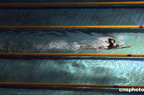 圖為一名參加奧運比賽的游泳運動員在晚上獨自練習的場景。