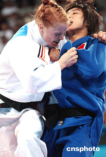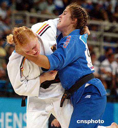 圖為在女子柔道-70公斤比賽中,加拿大選手ROBERGE Catherine和德國(guó)選手BOEHM Annett互相“搏斗”的畫(huà)面。