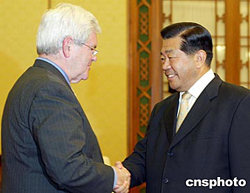 中新社北京八月十九日電(記者 邢利宇)中共中央政治局常委、全國政協主席賈慶林今天下午在人民大會堂會見了以美國前眾議院議長紐特·金里奇率領的美國對外政策理事會代表團。