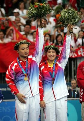 中新社雅典八月十九日電 中國(guó)雅典奧運(yùn)羽毛球隊(duì)今天一掃前兩日男單、男雙盡墨的陰霾。繼張寧摘取女單桂冠后,悉尼奧運(yùn)冠軍張軍/高崚又衛(wèi)冕成功。在剛剛結(jié)束的混雙決賽中他們以二比一的總比分戰(zhàn)勝了來(lái)自英國(guó)的羅伯遜/埃姆,三局比分分別為十五比一、十二比十五和十五比十二。