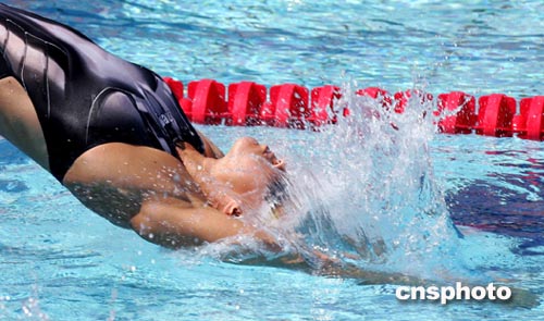 圖為當(dāng)?shù)貢r間8月19日女子兩百米仰泳比賽中德國選手Antje越入泳池的場景。