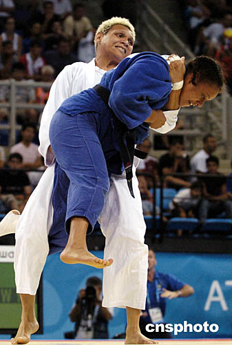 圖為在當(dāng)?shù)貢r(shí)間8月19日舉行的女子次重量級78公斤級柔道比賽中,巴西選手Edinanci Silva將法國選手Celine Lebrun“抱起”的情景。
