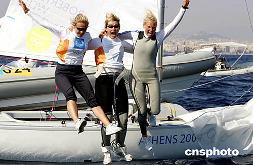 圖為英國(guó)隊(duì)在獲得今年才列入奧運(yùn)會(huì)比賽項(xiàng)目的女子龍骨船-鷹鈴級(jí)比賽冠軍后,齊聲歡躍的情景。