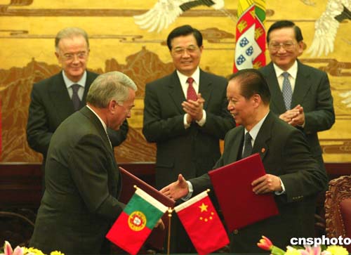 中國(guó)與葡萄牙一月十二日在北京簽署多個(gè)雙邊合作協(xié)議文本,中國(guó)國(guó)家主席胡錦濤與葡萄牙總統(tǒng)桑帕約出席簽字儀式。作者:滿(mǎn)會(huì)喬