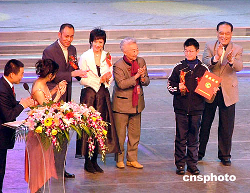 第七屆中國(guó)長(zhǎng)春電影節(jié)一月十二日晚在長(zhǎng)春落幕,年僅十六歲的鐘秋(右二)因在《我的法蘭西歲月》中成功飾演少年鄧小平一角,而獲得“新銳人物獎(jiǎng)”。作者:吳兆飛