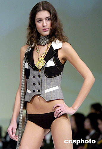 1月19日,香港會展中心舉行的“香港時裝節(jié)秋冬系列2005”獨家時裝表演專場,模特演繹秋冬性感系列。作者:洪少葵