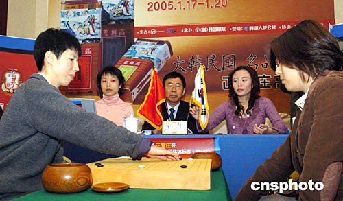 一月二十日,中國(guó)隊(duì)主將芮乃偉九段(圖左)執(zhí)黑中盤擊敗韓國(guó)隊(duì)主將樸志恩五段,使得中國(guó)隊(duì)獲得第三屆正官莊杯三國(guó)女子圍棋擂臺(tái)賽冠軍,這也是中國(guó)隊(duì)獲得的首個(gè)女子團(tuán)體賽冠軍。作者:湯彥俊