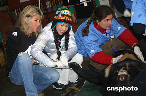 一月二十日,“拯救黑熊”愛(ài)心大使、香港藝人莫文蔚再次到訪亞洲動(dòng)物基金位于成都的黑熊救護(hù)中心,正式認(rèn)養(yǎng)一頭剛被四川省林業(yè)廳解救的亞洲黑熊,并為這頭幸運(yùn)的黑熊命名為“寶貝”。圖為莫文蔚(中)與亞洲動(dòng)物基金創(chuàng)辦人及行政總監(jiān)謝羅便臣女士(左一)一起為這頭黑熊做身體檢查。作者:魯彥