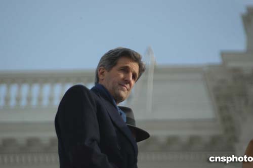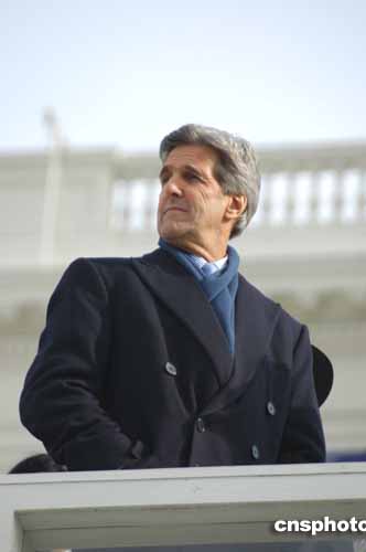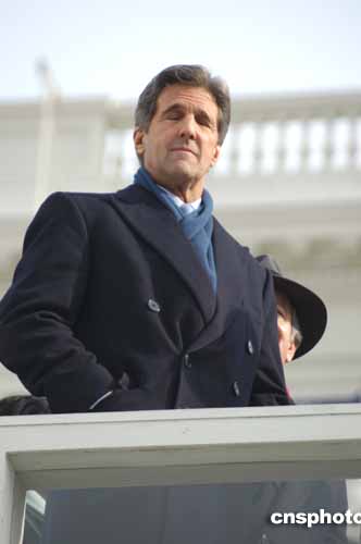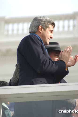 在去年底美國大選中敗給布什的民主黨參議員克里20日參加了布什就職典禮,坐在布什演講臺左側(cè)的第七排。在整個儀式過程中,克里表情嚴肅,神情落寞。當布什宣誓完畢,全場歡呼時,克里有禮貌地鼓掌,他身旁的另一位嘉賓拍拍他的后背,似在安慰克里。作者:余東暉