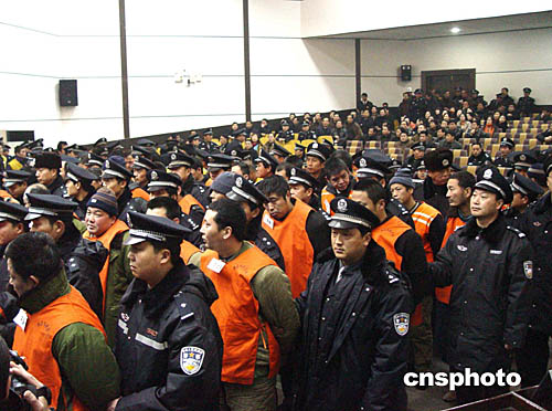 一月二十一日上午九時(shí),許昌市中級(jí)人民法院對(duì)“中原涉黑第一案”——宋留根、馬獻(xiàn)洲、郝洪山特大涉黑團(tuán)伙案,進(jìn)行一審宣判。以宋留根為首的涉黑犯罪團(tuán)伙是五十年來河南最大的犯罪集團(tuán)。圖為六十二名涉案人員在等待宣判。作者:胡珂