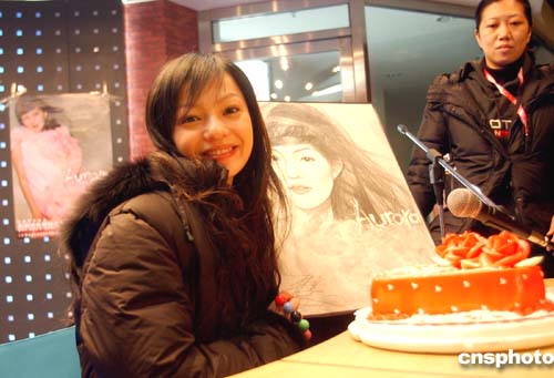 人氣急升的臺(tái)灣歌壇女新人張韶涵一月二十三日在北京舉辦歌迷見(jiàn)面會(huì),簽售新專輯《歐若拉》。圖為張韶涵展示歌迷送上的慶功蛋糕和畫(huà)像。作者:韓藝冰