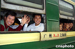 春運(yùn)拉開帷幕,在廣東中山市打工的外來人員愉快登上廣州開往上海的三五○次春運(yùn)臨時(shí)客車。今年廣州鐵路集團(tuán)春運(yùn)期間將安排一百四十二對臨客列車,接送返鄉(xiāng)過年旅客。作者:丁勇