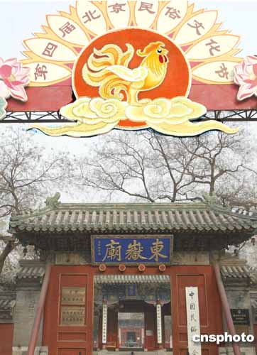“第四屆北京民俗文化節(jié)暨第七屆東岳廟春節(jié)文化廟會”將于二月八日至十五日在北京道觀東岳廟舉行,圖為裝飾一新的東岳廟懸掛起“金雞報春”圖。作者:錢興強