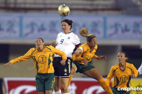 一月二十八日晚,二零零五年四國女足錦標賽在福建泉州進行首場比賽,澳大利亞隊以一比零的比分戰(zhàn)勝奧運會和世界杯雙料冠軍德國隊。圖為德國隊九號普林茨與澳大利亞隊員爭頭球。作者:盛佳鵬