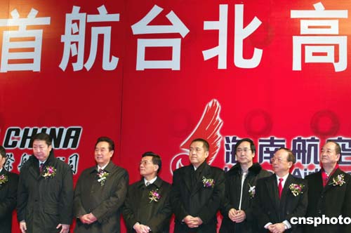 國(guó)航、海航首航臺(tái)北高雄儀式一月二十九日在北京首都國(guó)際機(jī)場(chǎng)舉行,國(guó)臺(tái)辦主任陳云林(左二)、副主任李炳才(左三)、國(guó)家民航總局局長(zhǎng)楊元元(左一)、北京市副市長(zhǎng)張茅(右四)、臺(tái)灣國(guó)民黨籍民意代表章孝嚴(yán)(右二)等出席儀式。作者:滿會(huì)喬