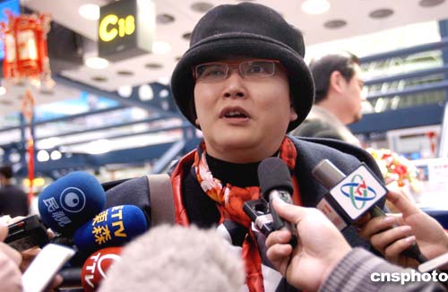 1月29日,鳳凰衛(wèi)視前主播劉海若在北京首都機(jī)場(chǎng)搭乘國(guó)航CA1087包機(jī)時(shí)接受媒體采訪。劉海若此次是以臺(tái)商家屬的身份搭乘春節(jié)包機(jī)航班回臺(tái)北。作者:韓藝冰