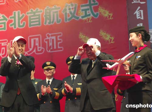 臺(tái)灣中華航空公司、臺(tái)灣長(zhǎng)榮航空公司的民航班機(jī)一月二十九日中午飛抵北京首都國(guó)際機(jī)場(chǎng),并在機(jī)場(chǎng)舉行首航儀式。北京市副市長(zhǎng)張茅(左)與臺(tái)灣中華航空公司總經(jīng)理魏幸雄互贈(zèng)禮品。作者:滿會(huì)喬