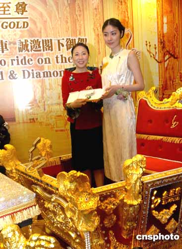 金至尊主席伍綺媚(左)29日在九龍尖沙咀彌敦道上一家分店開業(yè)儀式上向歌星(金至尊代言人)陳慧琳贈(zèng)送禮品。作者:趙振清