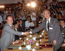 1993年4月,辜振甫受權(quán)與海峽兩岸關(guān)系協(xié)會汪道涵會長在新加坡舉行汪辜會談,簽署四項協(xié)議。這是汪辜會談前,汪道涵(前左)與辜振甫握手(資料照片)。