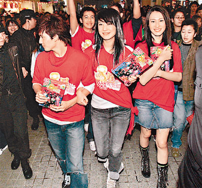 雖然Twins身在臺(tái)灣而缺席,但英皇五星的出現(xiàn)同樣哄動(dòng),加上打鑼打鼓的舞龍儀式,令現(xiàn)場(chǎng)氣氛推至高潮!熱情的歌迷重重包圍,令五星寸步難行。當(dāng)開(kāi)始派發(fā)揮春時(shí),歌迷瘋狂上前搶奪,場(chǎng)面一發(fā)不可收拾,為顧及安全,沒(méi)到兩分鐘,五星就連忙登車(chē)離去。身穿迷你短裙的Isabella,活動(dòng)未開(kāi)始前,還表示不擔(dān)心混亂中被摸,但當(dāng)她被擠在人群當(dāng)中,不禁表現(xiàn)驚慌,一直雙手護(hù)胸。而Yumiko則由Boy'z的Kenny保護(hù),最后五星在保安開(kāi)路下離開(kāi),此時(shí)才可以輕松地向Fans揮手道別。