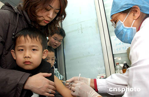 二月二日,北京市疾病控制中心醫(yī)務人員為一名兒童接種流腦“A+C”疫苗。北京近日從蘭州緊急調(diào)運了十萬份疫苗,今天下午已開始市民進行接種。截止到目前,北京至今未發(fā)現(xiàn)C群流腦疫情。作者:韓藝冰