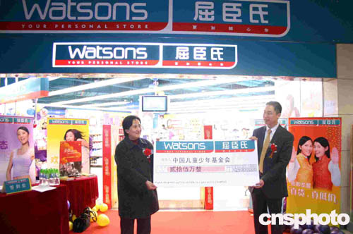 中新網(wǎng)北京二月三日電(記者張希敏)春節(jié)將至,位于北京東方廣場(chǎng)的屈臣氏個(gè)人護(hù)理商店,今天在重張之際,繼續(xù)向中國(guó)兒童少年基金會(huì)“春蕾計(jì)劃”捐款二十五萬(wàn)元人民幣,用以救助失學(xué)女童。