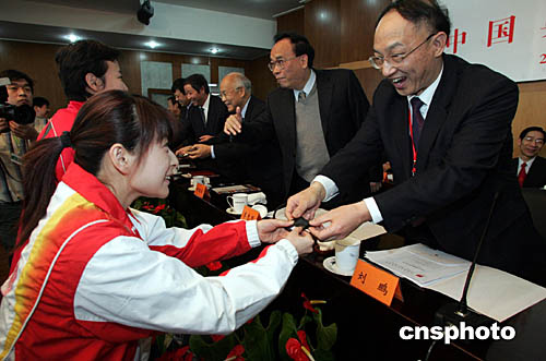 會(huì)上,中國(guó)奧委會(huì)領(lǐng)導(dǎo)向在雅典獲得獎(jiǎng)牌的運(yùn)動(dòng)員代表郭晶晶、馮坤、張寧等頒發(fā)了國(guó)際奧委會(huì)授予的奧林匹克紀(jì)念章。
