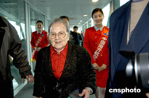 圖為今年已經(jīng)八十六歲梁老太,在兒子的陪同下,成為第一個走出機艙的旅客。作者:劉衛(wèi)勇
