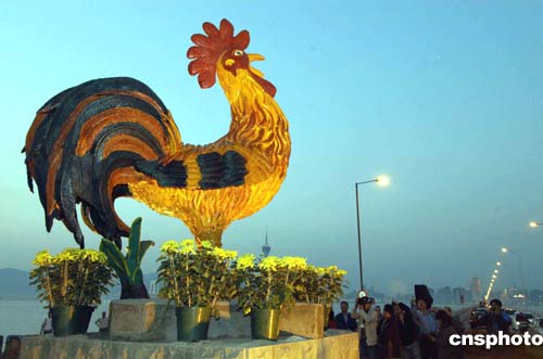 雄雞賀新春,七日,澳門民政總署為一座高三米的“生肖雞”塑像舉行揭幕儀式,這座雄雞色彩斑斕,氣度不凡,祈望為澳門帶來好運。作者:梁永強