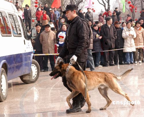 北京警方在春節(jié)期間增加了一項(xiàng)特殊工作,二月十二日公安警犬隊(duì)訓(xùn)犬員,乘警車(chē),牽警犬在第二十二屆春節(jié)龍?zhí)稄R會(huì)主會(huì)場(chǎng),為千名游園觀眾表演警犬搜捕、跨越障礙、緝毒、擒敵等節(jié)目。作者:鄒憲