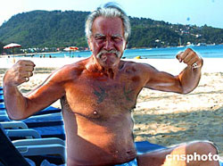 在一處海灘旅游景點上,一位老年游客展示其健壯身軀,表達海灘旅游的熱趣。海嘯地震過后,布吉島當?shù)叵嚓P(guān)方面積極刺激旅游業(yè)發(fā)展,目前游客人數(shù)日益增多,往日的繁榮正在逐步復蘇。作者:宋吉河